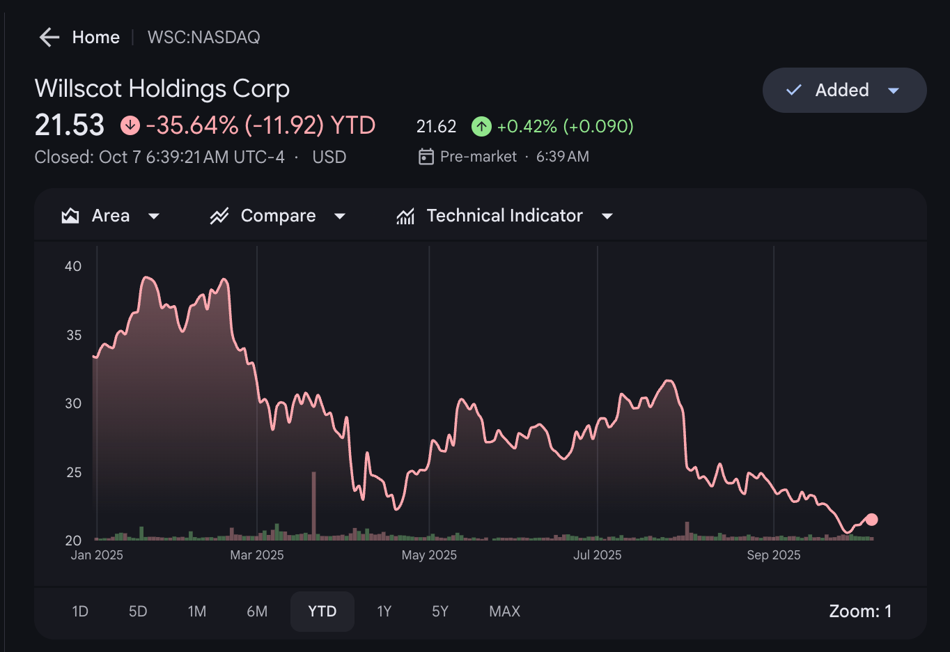 I found this short thesis on WSC on Substack and it’s a great write-up for understanding why investors do not like the stock. Credit to Keith Dalrymple for the work he did on the fleet and demand for specific types of units; I agree he could be right that the fleet doesn’t have enough climate-controlled and other units customers want, and having to purchase this inventory might drive capex up. I think the claims he brings up on depreciation accounting are valid.