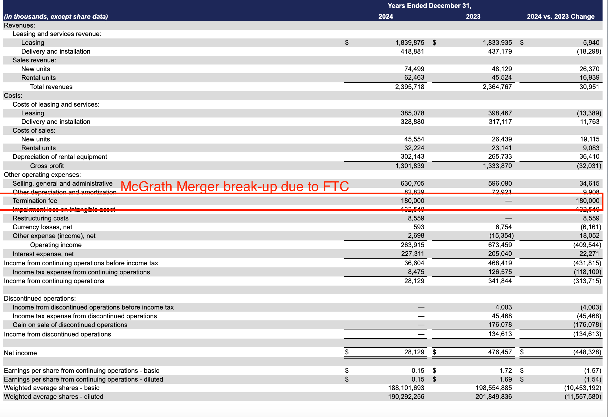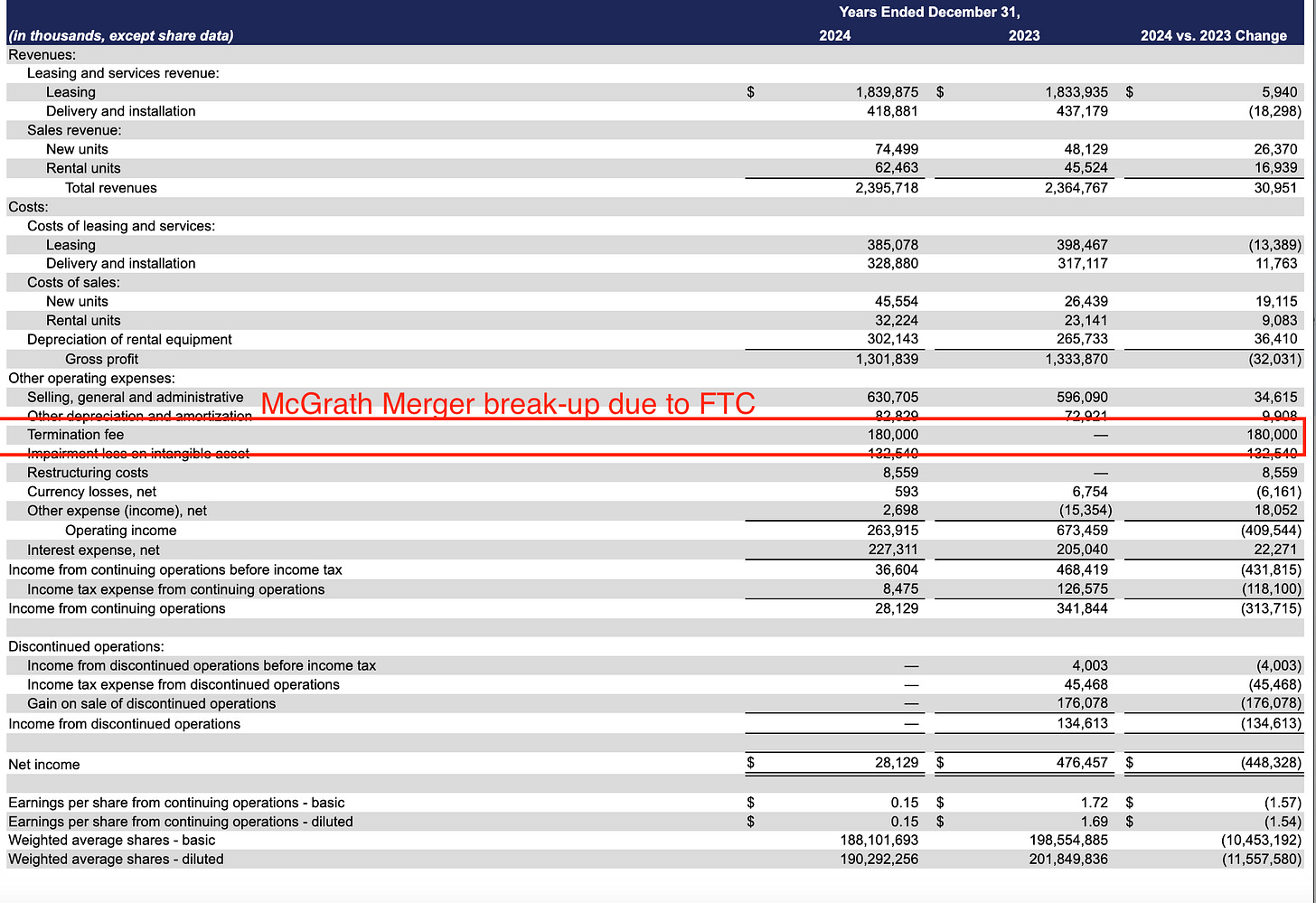 Unsaid in that announcement is they would’ve taken out a key competitor and had more pricing power over the market, which is exactly why the FTC opposed the merger and WillScot abandoned it in September 2024. From the FTC following the termination of the merger (emphasis mine):