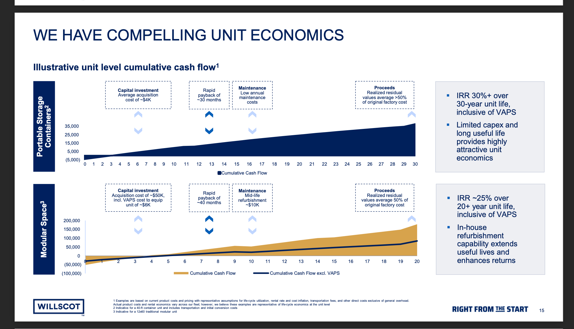 I’m always tempted to compare leasing businesses to Triton and Textainer but I think where the comparison falls apart here is 1) duration of leases / renewal risk and 2) residuals. Shipping containers might be on lease by the same company for decades; for WSC, once a lessee completes a construction project, they don’t need the trailer anymore.