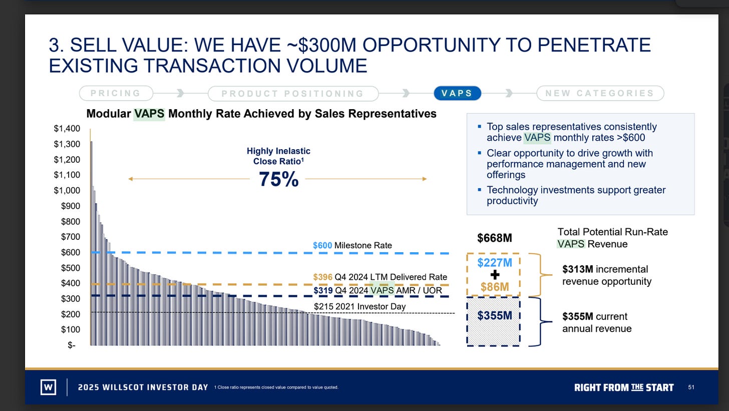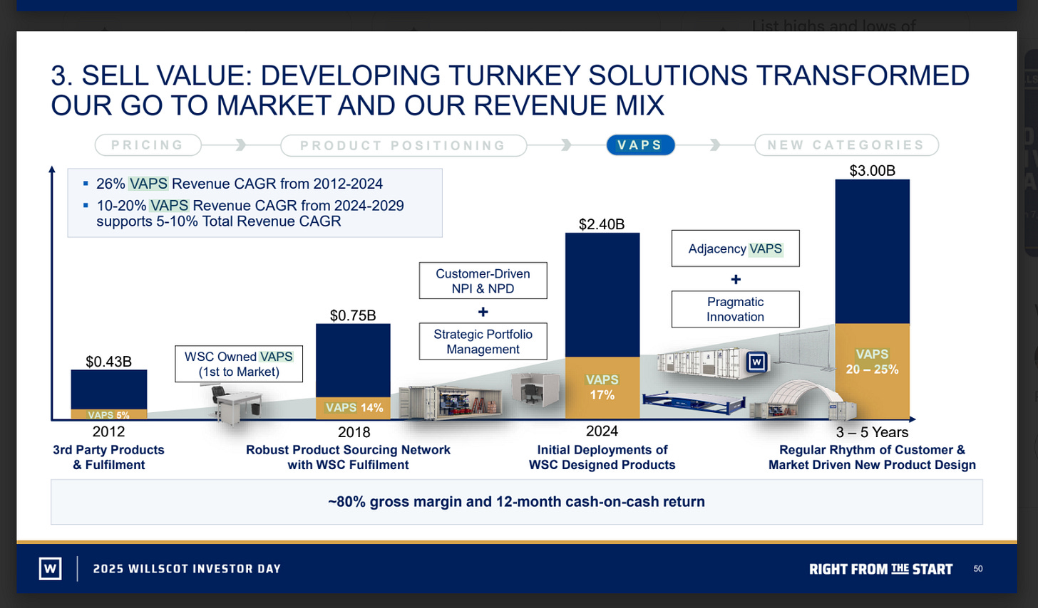 The company also makes a small but high-margin portion of revenue on Value Added Products and Services, or VAPS. VAPS include services like adding HVAC, internet or furniture to a unit and per the company is 70% gross margin. The company cites VAPS as one reason EBITDA margins have been able to flex 40%+. Per the last investor day, VAPS is a significant part of the margin and sales growth story:
