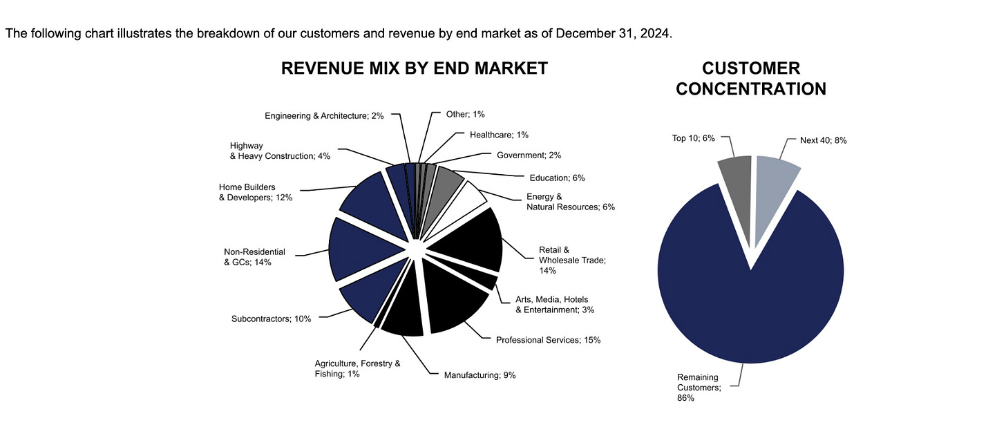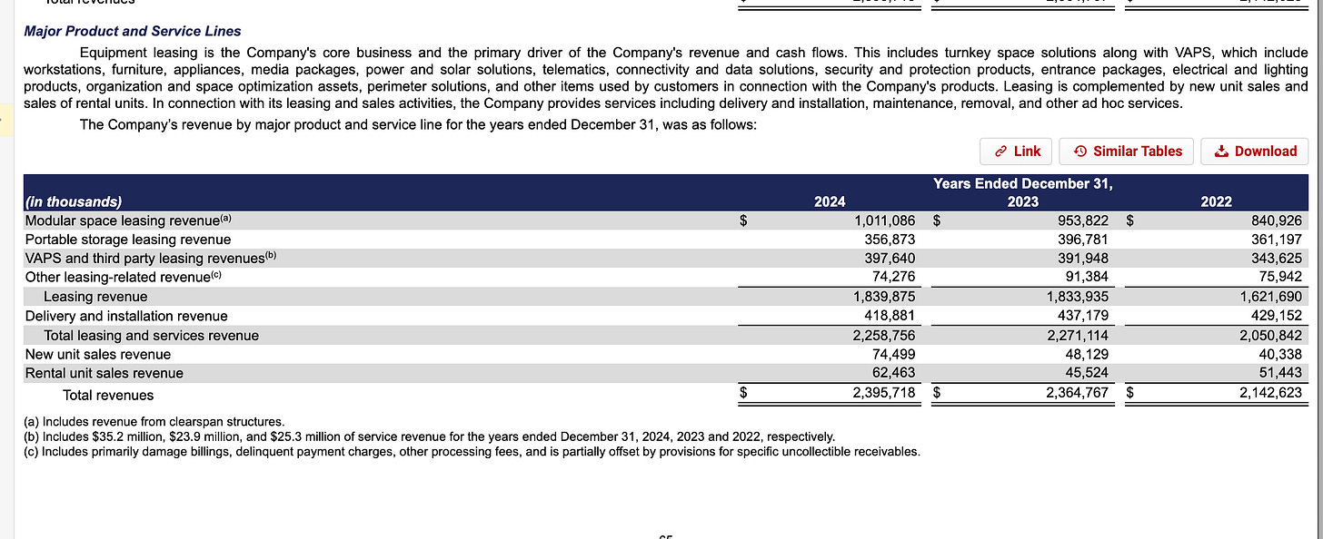 I’m sure most people reading this have seen the trailers that serve as temporary space for construction and other projects; I saw a few recently when a new high school was going up in my hometown. WSC leases these trailers to a variety of end customers (see graph below for industry breakdown) and as of 12/31/24 owned 152K modular space units (think of as temporary buildings) and 210K portable storage units (think of as containers to store stuff and not people). About 60% of the revenue is modular space and 40% is storage.