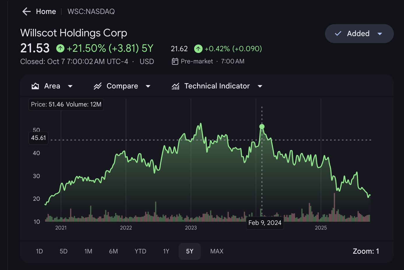 One more PE thought - WSC (founded 1955) has been under PE ownership before. The company went public on NASDAQ in 2005 and two years later was acquired by mobile office and storage building company Algeco, which at the time was a portfolio company of TDR Capital. Cypress - another PE firm - owned about 27% of the company at the time of acquisition per that article. Algeco / TDR exited via a SPAC in 2017 which made the company public again.