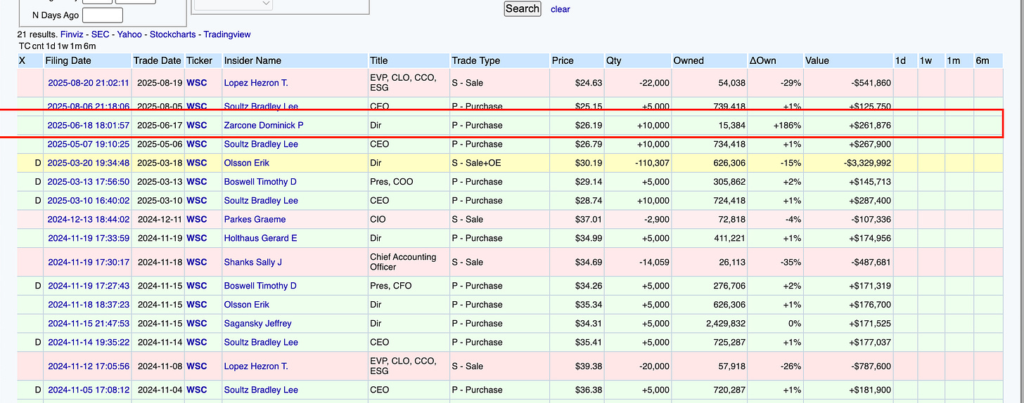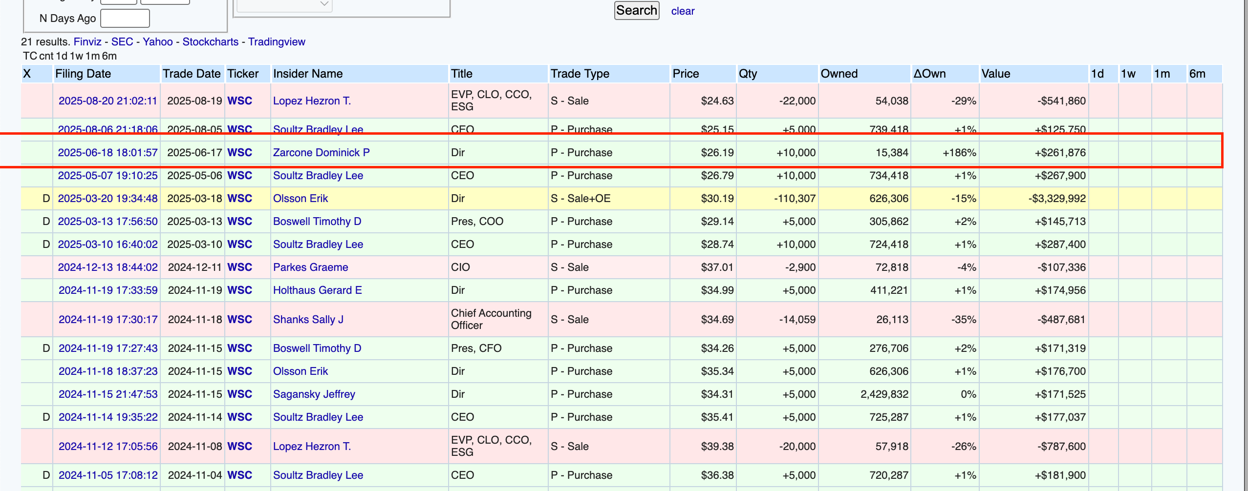 In March 2025, the company showed TOMS they’re listening and put Nick Zarcone on the board. That PR release had both WSC and TOMS Chief Investment Officer and co-founder Benjamin Pass complimenting each other and suggested they’re working together. Zarcone did buy ~$262K of stock on the open market in June when the stock was trading at $26: