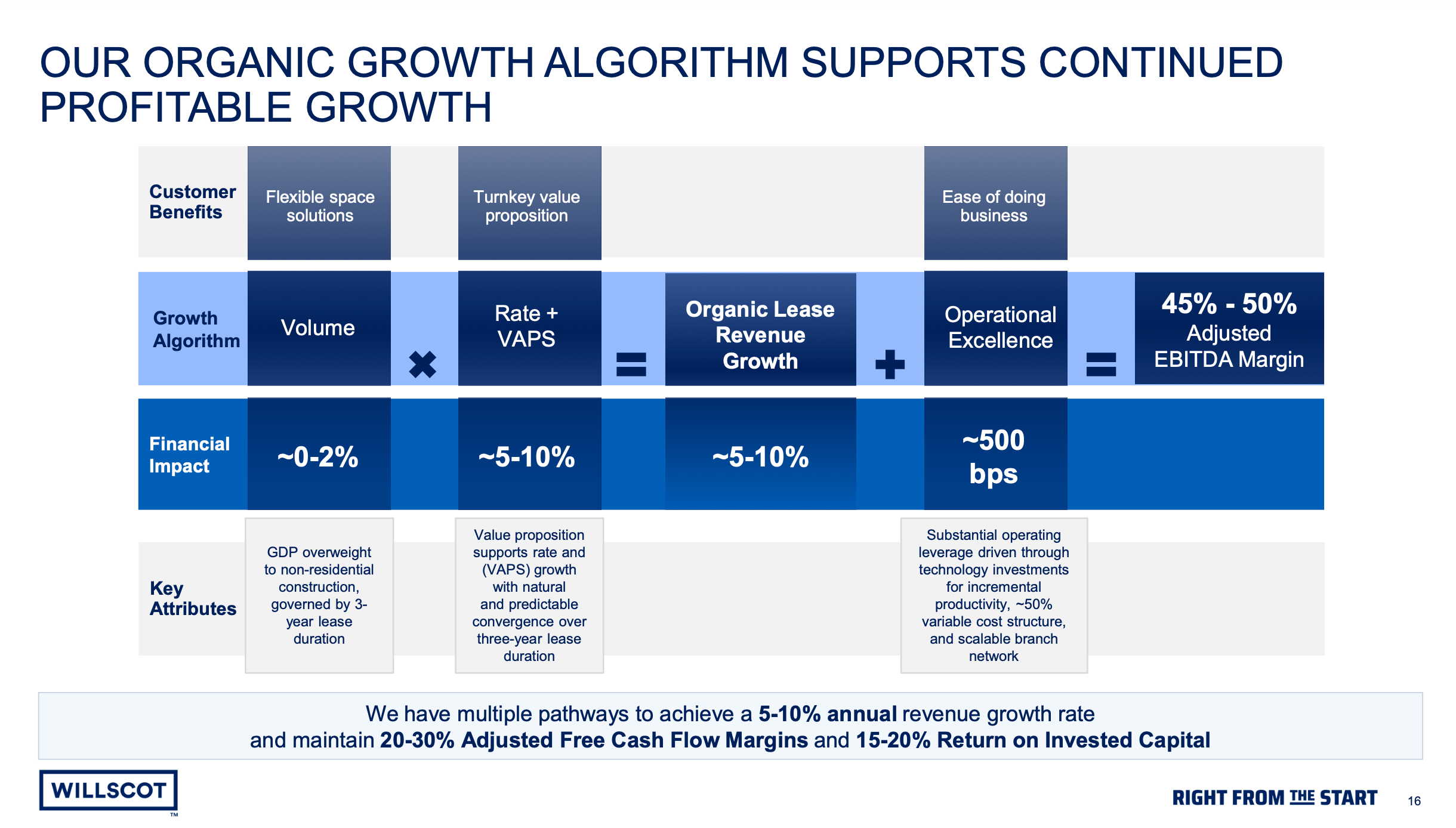 I’ve spent most of this post talking about the last year of meaningful corporate events and want to talk about why I like the business now. WSC has been around for 70 years and has expanded over time via a series of acquisitions, including Mobile Mini in 2020. ~50% of adjusted EBITDA growth has been acquired.