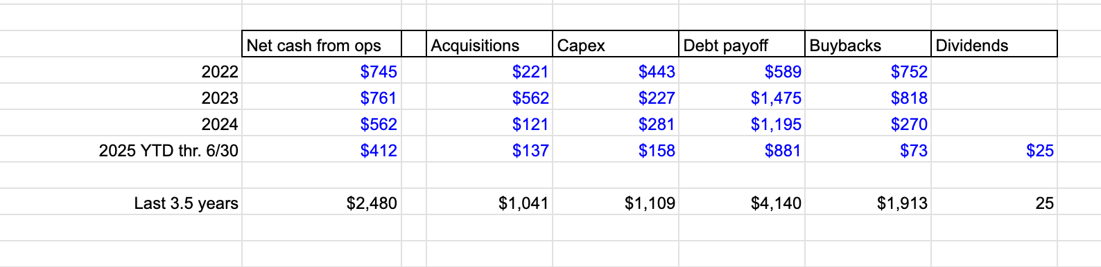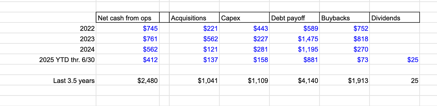 Finally, just looking at capital allocation, WSC could turn off buybacks and the dividend to free up cash to pay lenders. They’ve generated in the last 3.5 years almost $2.5bn of net cash from operating activities and paid back $4bn of debt (granted, a lot of this is noise from refinancing). Since 2022, here is what capital allocation looks like: